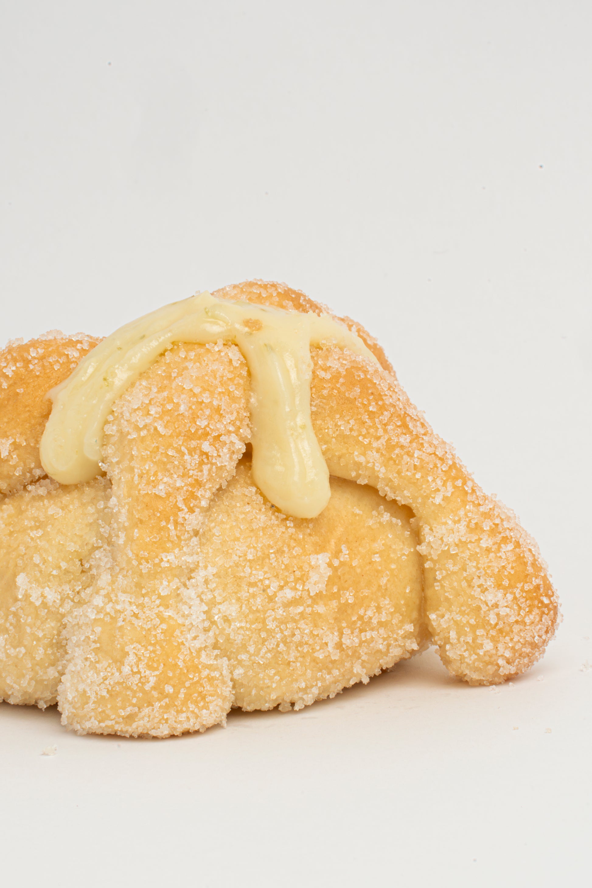 Pan dulce de tradición mexicana con una forma muy particular que se consume especialmente en Día de muertos. Es de textura muy suave, bañado en mantequilla y azúcar con ligero aroma de azahar.